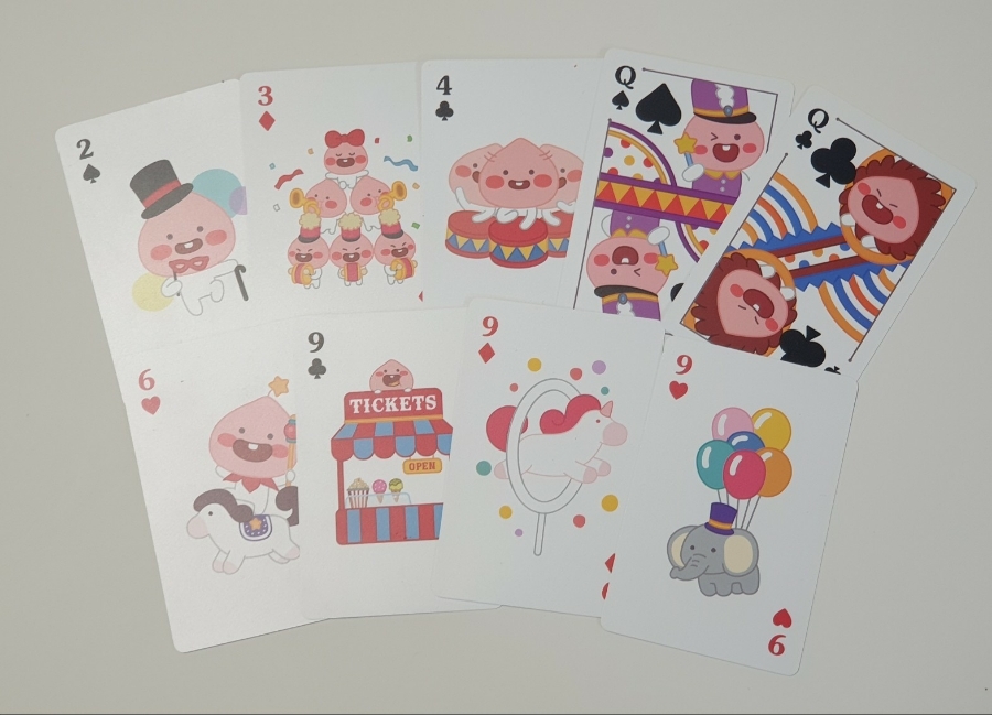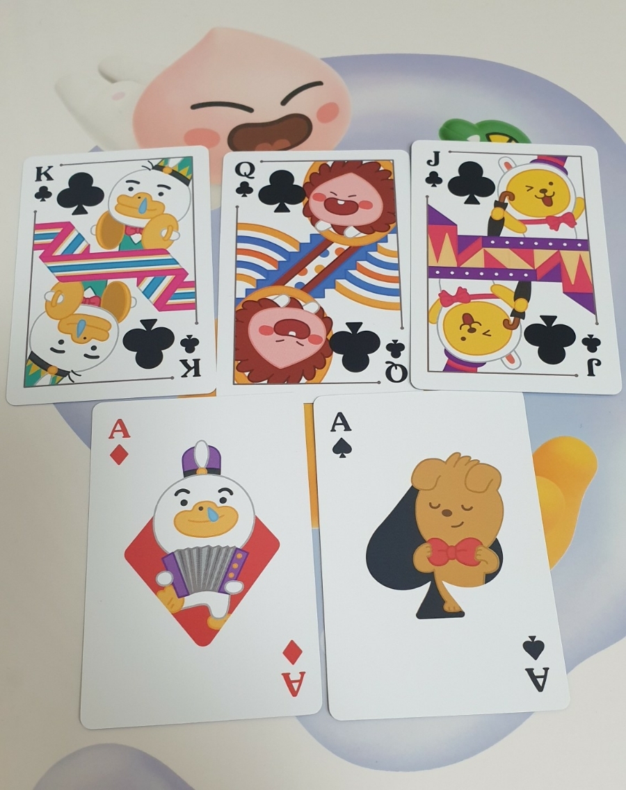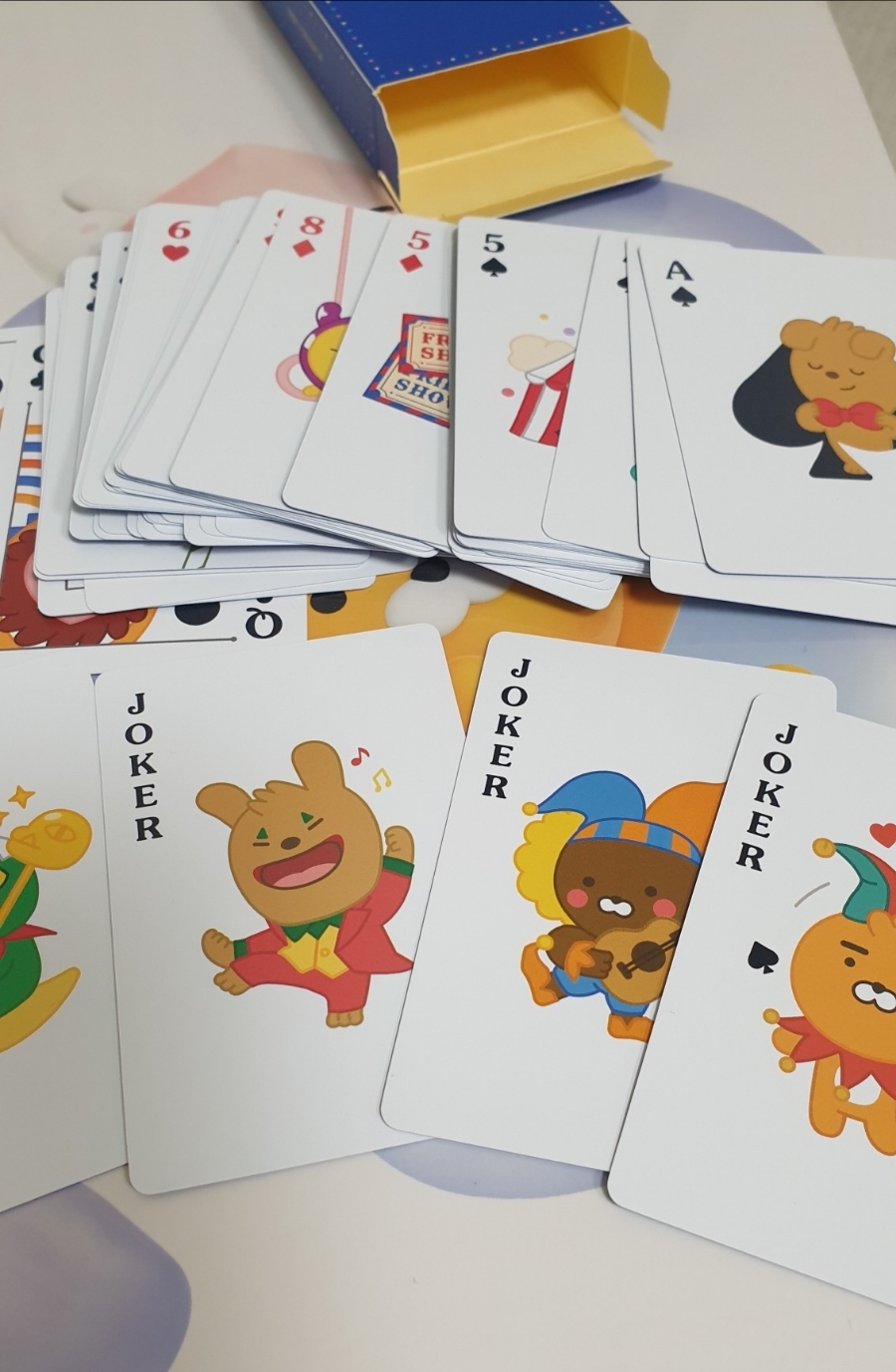 카드 앞면을 봤어요. 카드 앞면은 뒷면과 다르게 카카오프렌즈 캐릭터들이 인쇄되어 있어요. 카드는 총 56장 들어 있구요. 카드의 재질은 종이가 아닌 플라스틱이라 구겨지거나 찢어지는 않을 것 같아 좋네요.