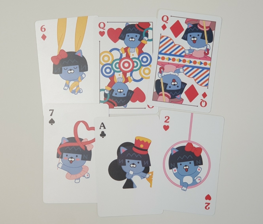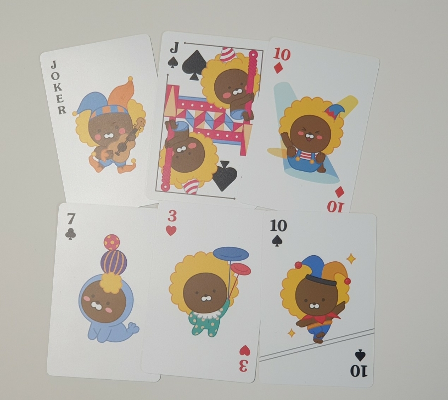 라이언 카드 입니다. 라이언 카드는 총 6장의 카드가 있구요. 라이언 카드에는 조커 카드가 포함되어 있어요. 라이언이 카카오프렌즈 대표 캐릭터 이지만 6장만 있는 이유는 뒷면은 라이언이 장식했기 때문이 아닐까 생각이 드네요. 라이언 카드는 삐에로 라이언과 공을 타는 라이언, 마술사 라이언 등등이 그려져 있어요.