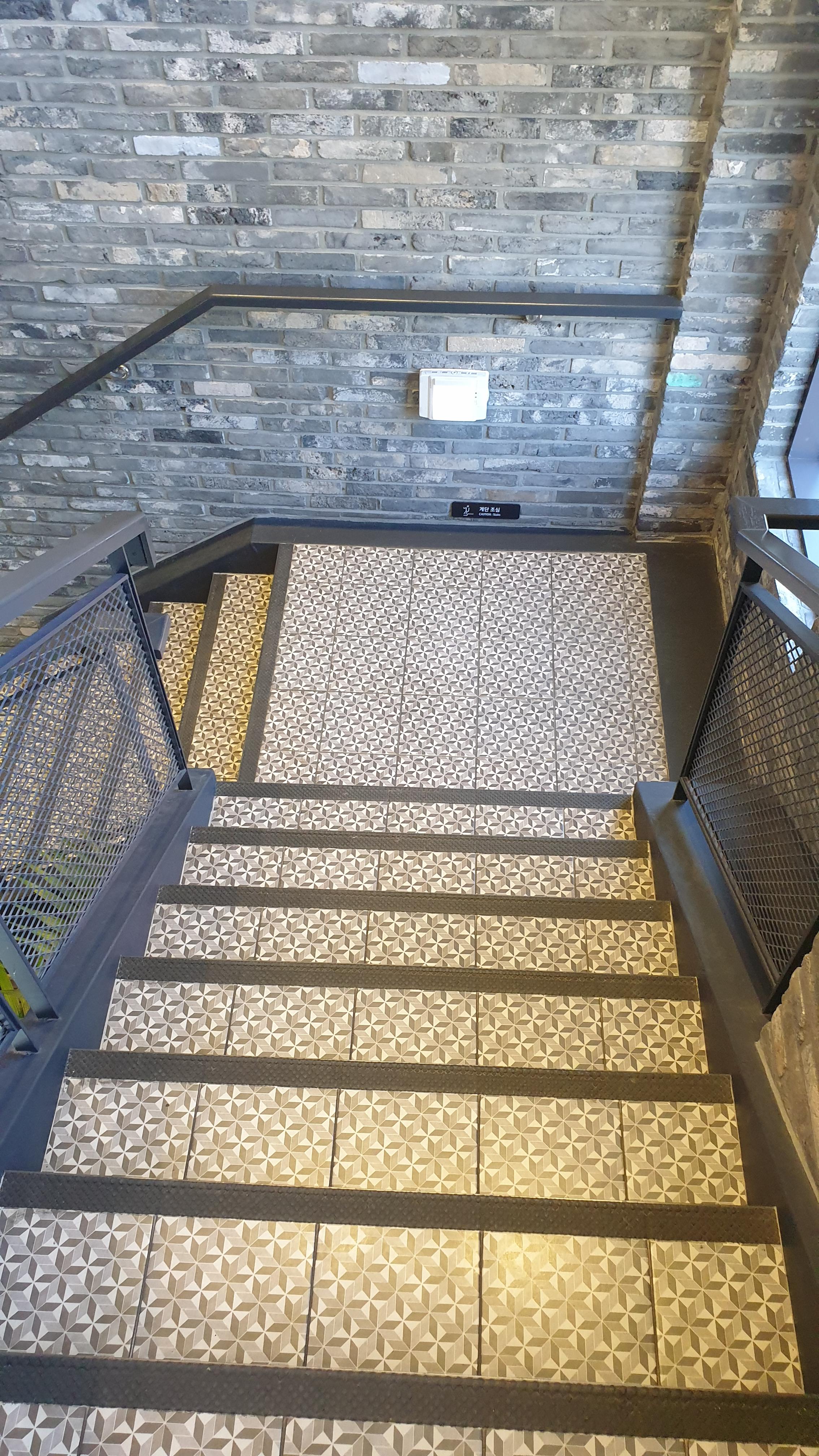 저희는 2층으로 올라가서 먹었어요. 1층은 아무래도 유동인원도 있고 해서 2층을 선택했어요. 매장이 깔끔하더라구요. 2층으로 올라가는 계단을 한번 찍어봤어요. 그레이톤 파벽돌에 유럽풍?의 타일, 타일 끝부분에 미끄럼 방지 패드가 붙어 있네요. 2층에도 커피를 마시는 분들과 공부하는 분들이 있더라구요. 그래서 사진은 찍지 못했구요. 2층에 올라가서 오른쪽은 커피를 마시는 공간, 왼쪽은 공부를 할 수 있는 공간으로 구분되어 있어요. 딱봐도 여기는 공부하는 공간이구나를 알 수 있어요. 공부하는 공간은 큰 테이블과 둘이 이용 할 수 있는 작은 테이블이 일렬로 정렬되어 있었고 그 공간은 4줄 정도 있었던 것 같아요. 저희도 컴퓨터를 할거여서 공부하는 공간에서 커피를 마시면서 데이트를 했지요.