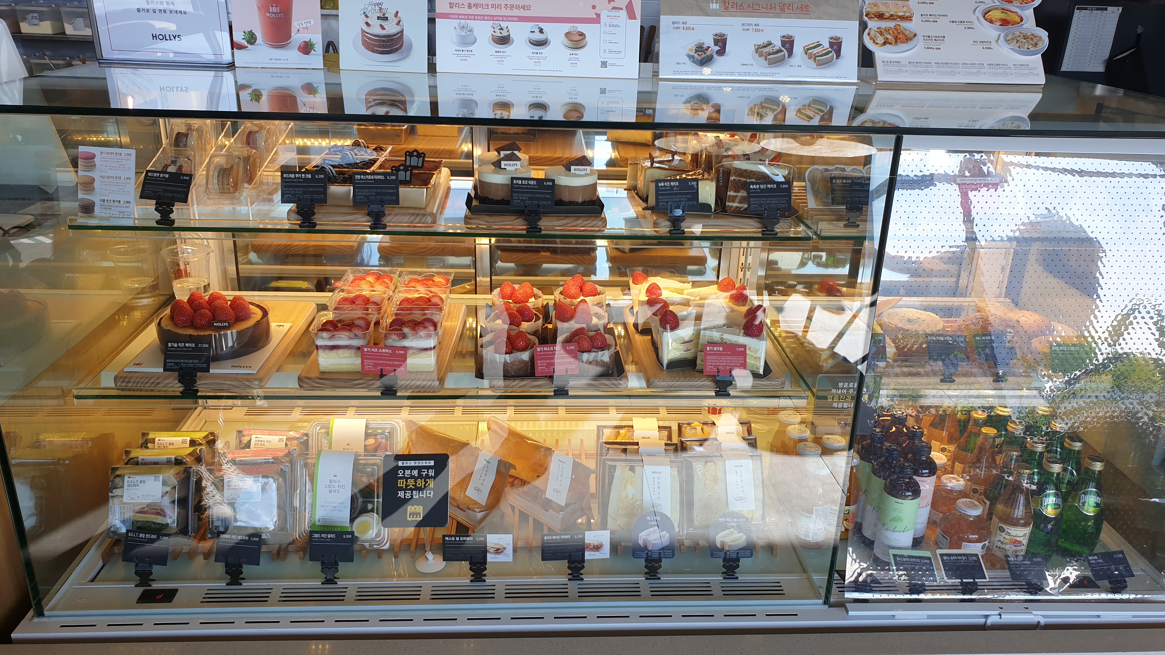 저희는 매장에서 먹을 예정이여서 QR 코드를 입력하고 주문을 하려고 카운터로 갔어요. 카운터 옆으로는 보이는 것처럼 샌드위치와 조각케이크, 홀케이크, 마카롱 등을 판매하고 있더라구요. 딸기로 만든 케이크 제품이 많이 있더라구요. 주문을 하려고 하는데, 점원분께서 딸아이는 학생증을 보여줘야 한다고 하더라구요. 그래서 초등학생인데요 했더니, 죄송합니다. 중학생인줄 알았어요. 그러더라구요. 중/고등학생들은 학생증을 제시해야 하나봐요?