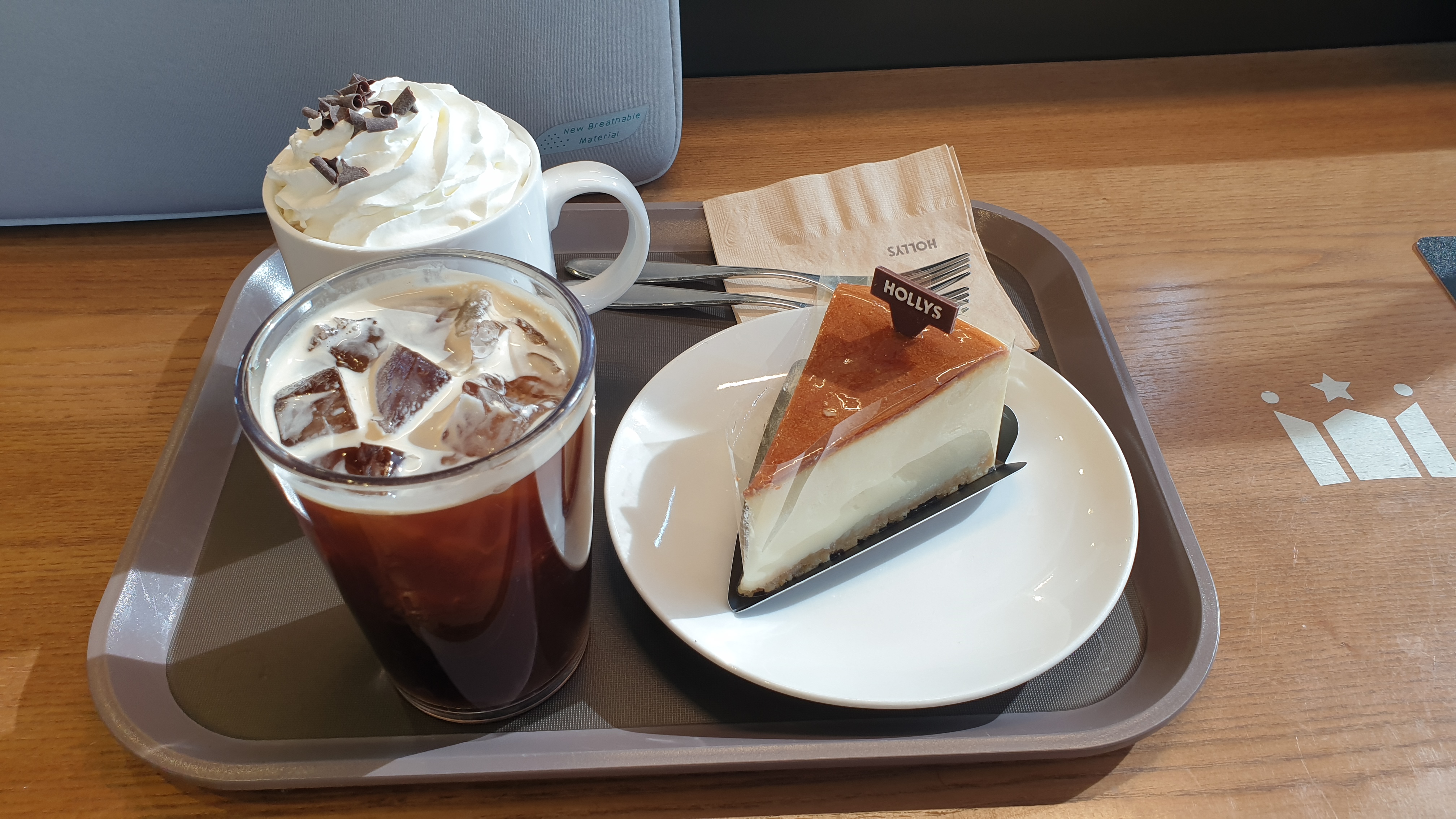 저는 딸과 둘이 데이트를 하기 위해 방문을 했습니다. 아침을 먹고 가서 어느정도 배가 불러서 음료와 치즈케이크만 시켜서 먹었어요. 저는 아이스아메리카노, 딸은 핫초코 with 휘핑크림을 주문했습니다. 커피는 무난한 맛이었구요. 핫초코는 딸한테 물어보니까 맛있다고 하네요. 치즈케이크는 스폰지처럼 부드럽드라고요.