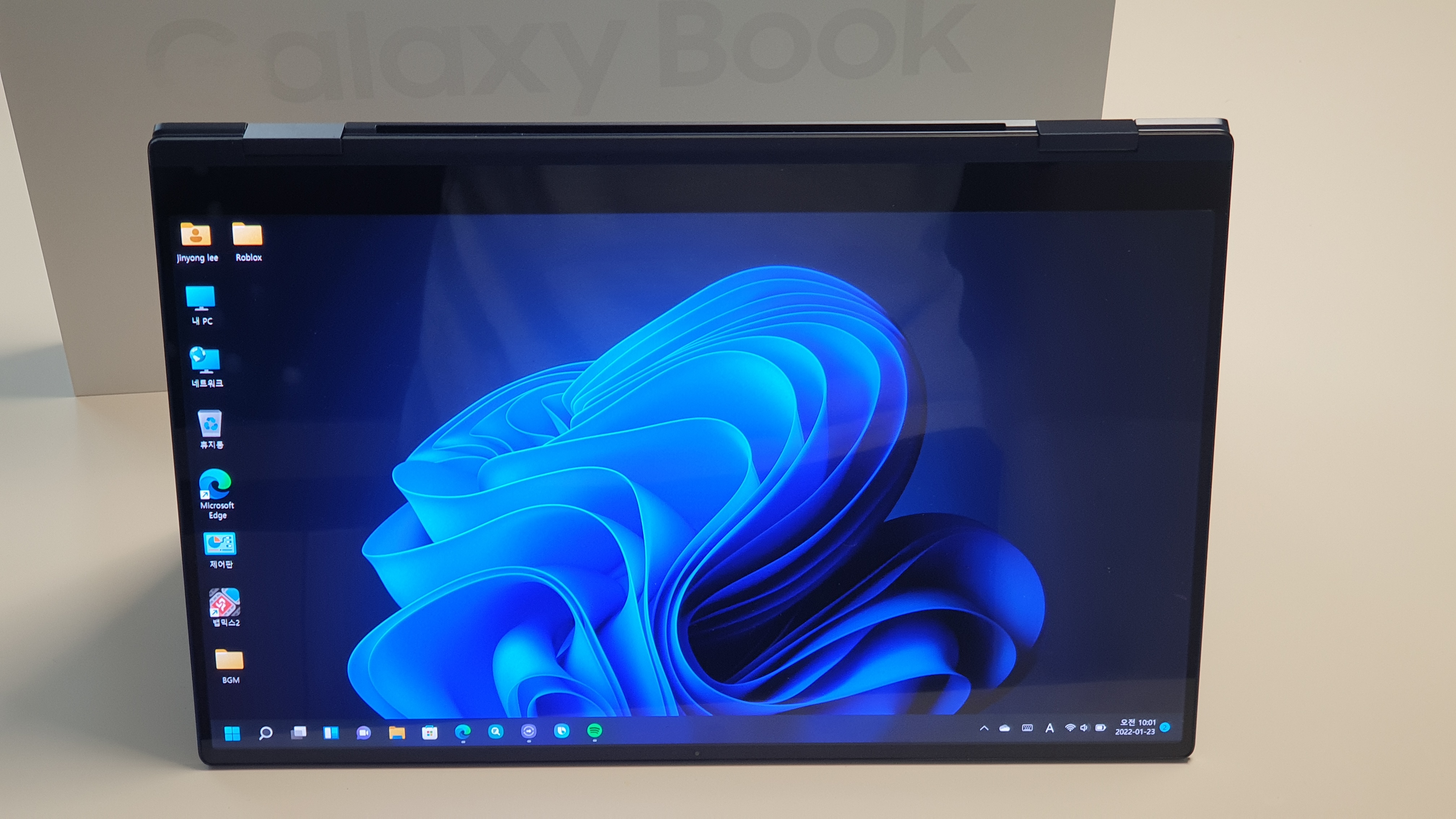 언박싱 후 전원을 넣어 봤습니다. 멋지네요. 가로/세로/180도 모두 정상적으로 회전하면서 태블릿 모드로 사용 가능하더라구요. 태블릿 모드는 일정 각도 이상으로 디스플레이가 접히면 자동으로 태블릿 모드로 진입합니다.