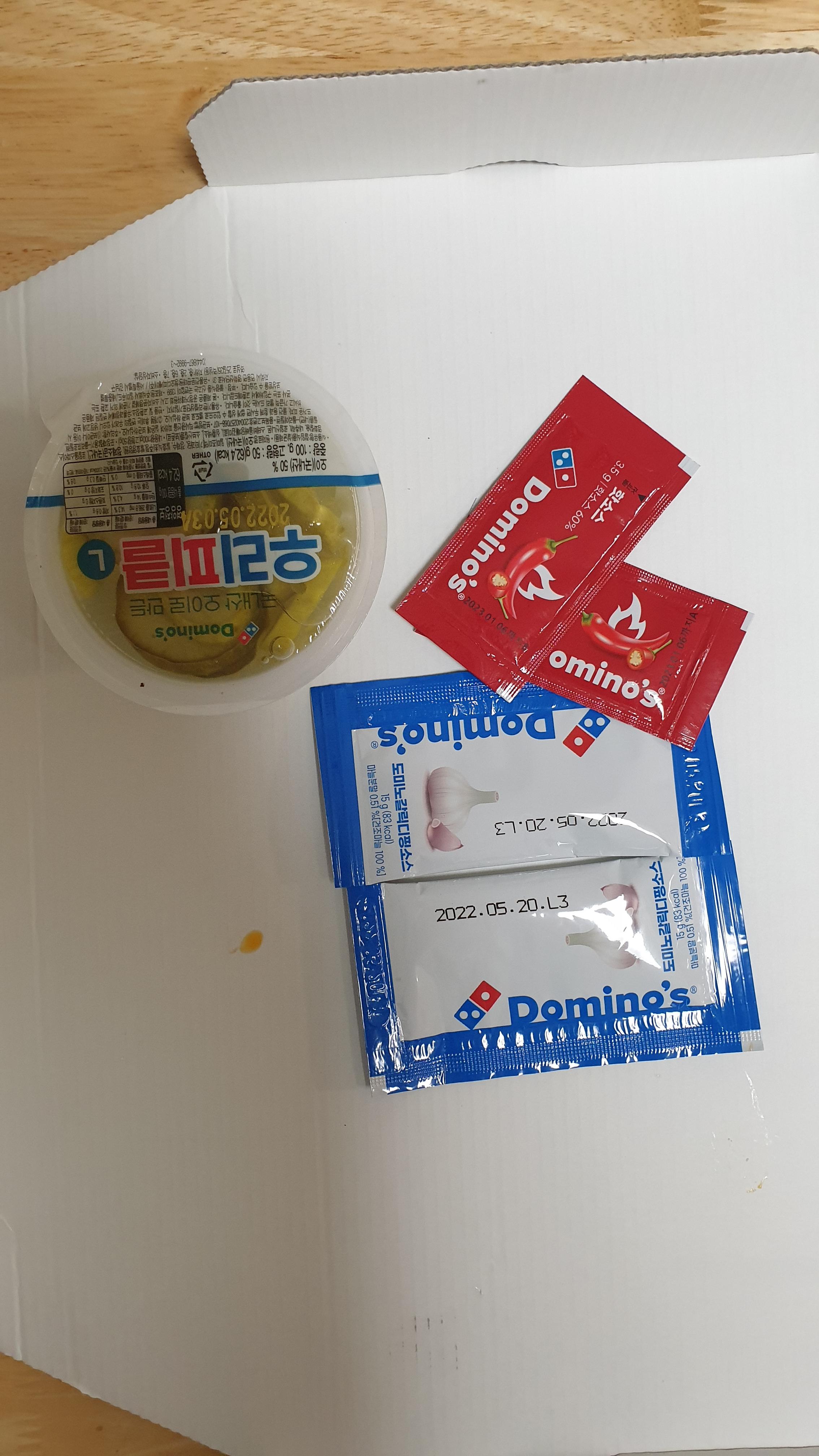 같이 온 핫소스와 도미노갈릭디핑소스, 우리피클이 같이 있어요. 소스와 같이 먹으니까 더 맛있게 먹을 수 있더라구요.