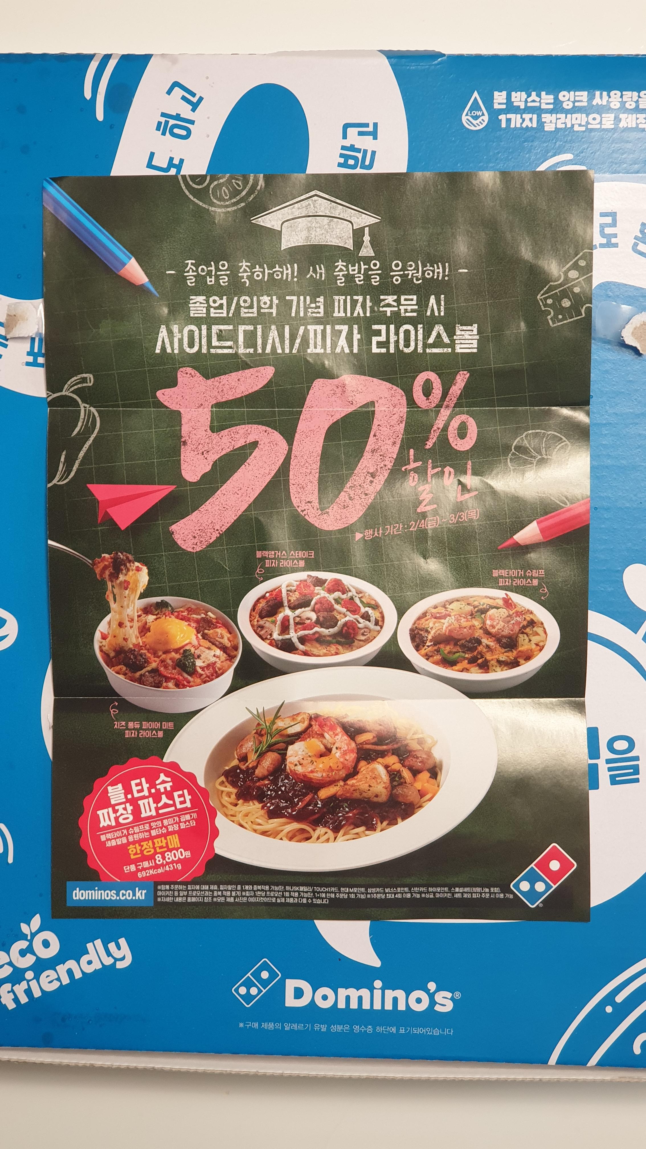 전단지 앞면과 뒷면입니다. 졸업을 축하해 새출발을 응원해 이벤트 졸업/입학 기념 파자 주문시 사이드디시/피자 라이스볼을 50% 할인해준다고 하네요.