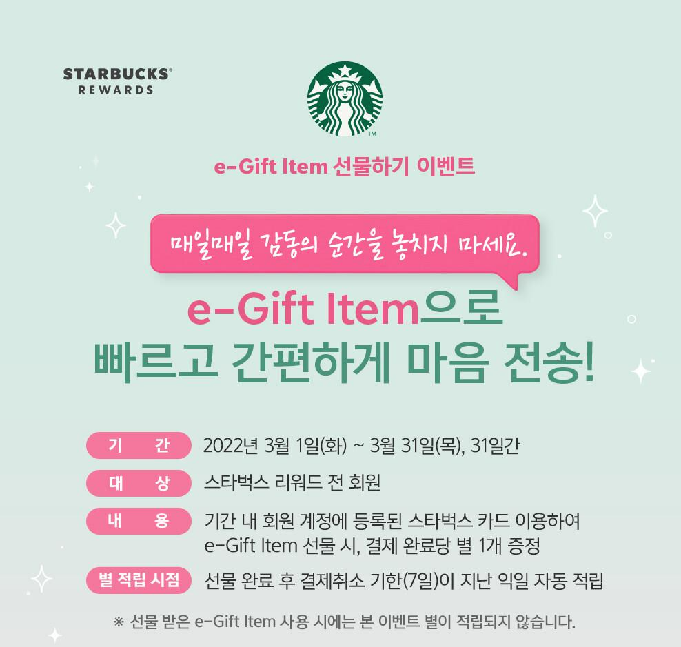 - 내 용 : 기간 내 회원 계정에 등록된 스타벅스 카드 이용하여 e-Gift Item 선물 시, 결제 완료당 별 1개 증정