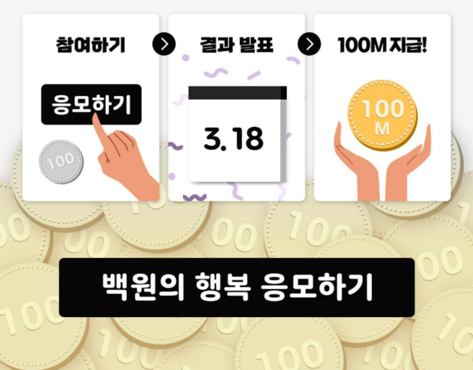 참여하는 방법은 아래 백원의 행복 응모하기 버튼을 누르시면 됩니다.