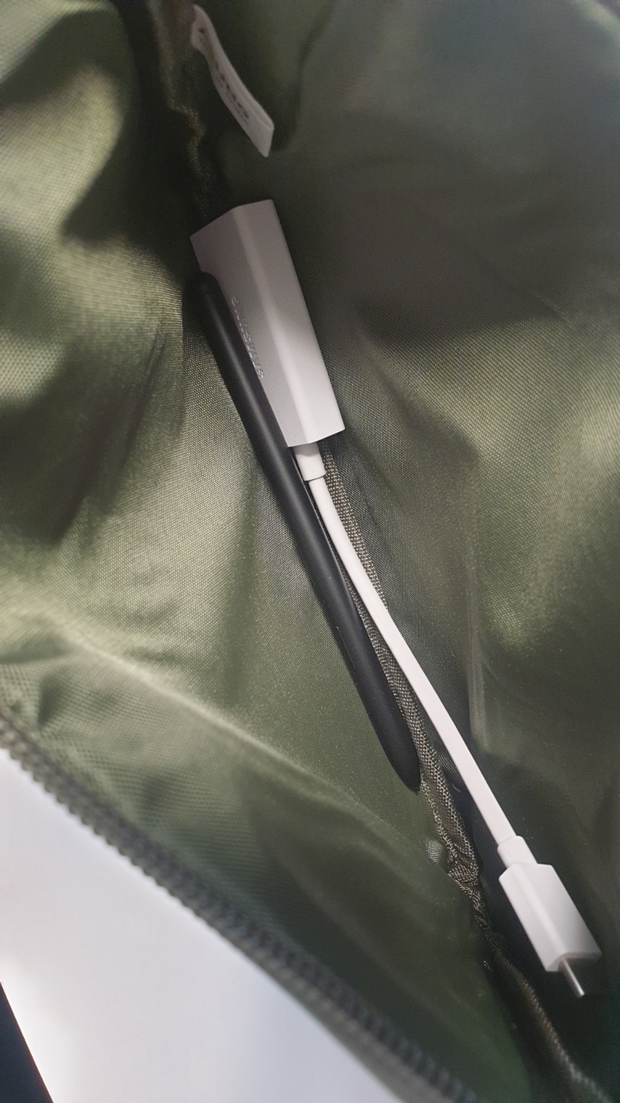파우치 안에 젠더랑 S펜을 넣어봤어요. S펜을 넣을 만큼 길이가 길고 깊네요. 젠더 외에도 마우스랑, 충전기를 넣어도 충분한 사이즈 입니다. 제가 넣고자 하는 물건들은 모두 들어 갈 수 있는 크기여서 너무 좋아요. 물거늘 잃어 버릴 일이 없을 것 같아요. 그리고 외부 크기가 제 노트북 가방에 들어가기 딱 좋은 사이즈여서 더더욱 마음에 드네요.