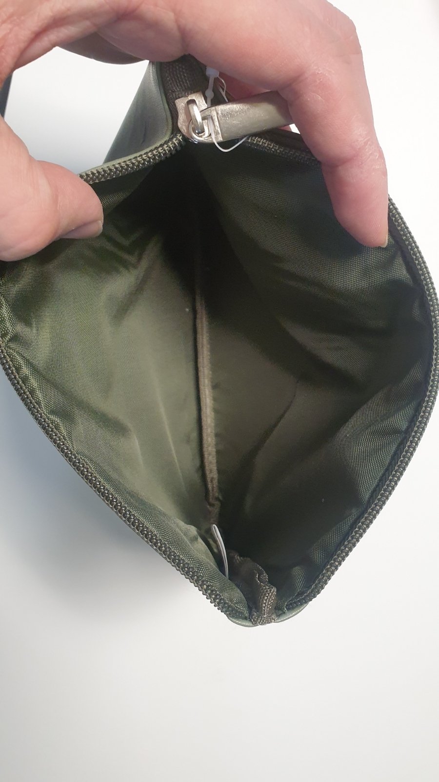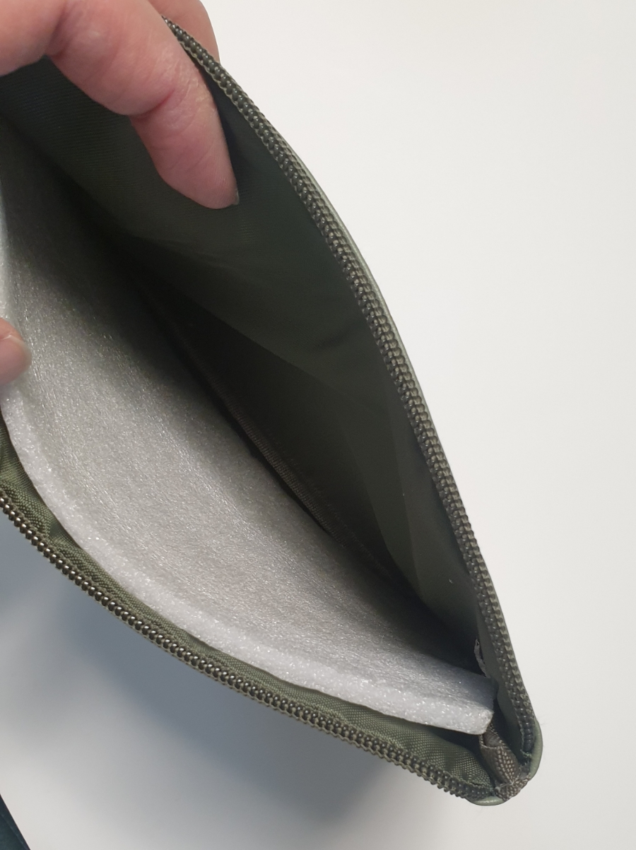 파우치의 겉모습이 흐느적 하는 것을 방지하기 위해 얇은 스트로품이 들어 있어요. 저 스트로품이 있고 없고에 따라서 제품이 흐느적 거리고 안흐느적 거리네요. 제품의 안감도 카키색으로 되어 있어요.